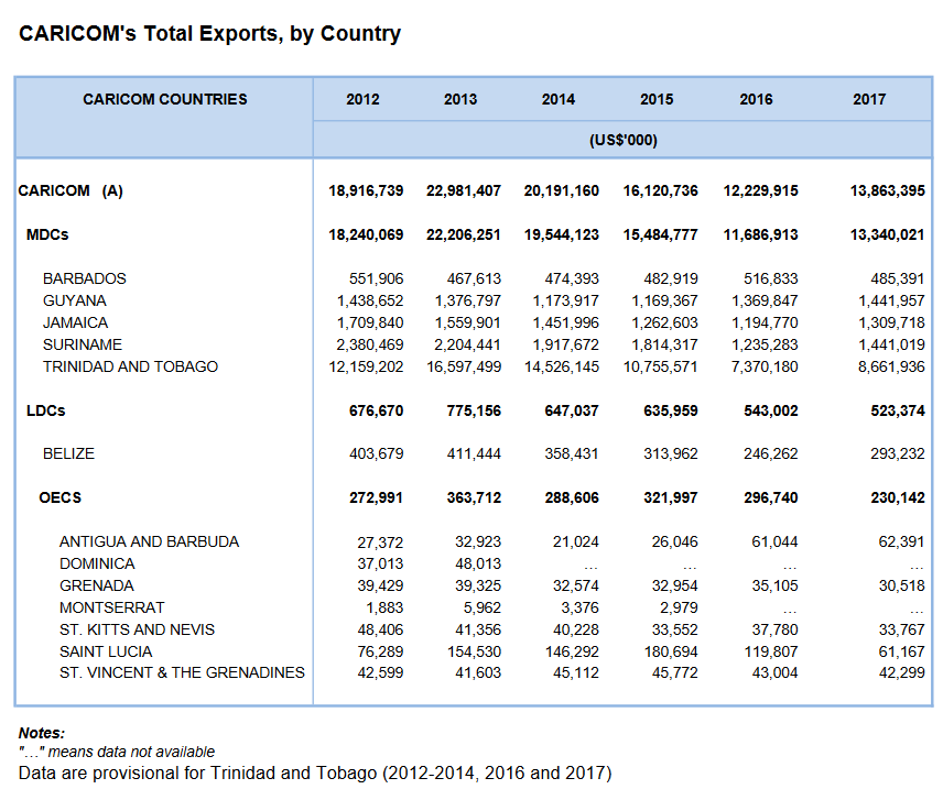 As we can see in these two tables above, the CARICOM’s number of imports in dollars is much bigger than the number of exports from 2012 to 2017. This indicates a trade deficit because the commercial balance is negative.